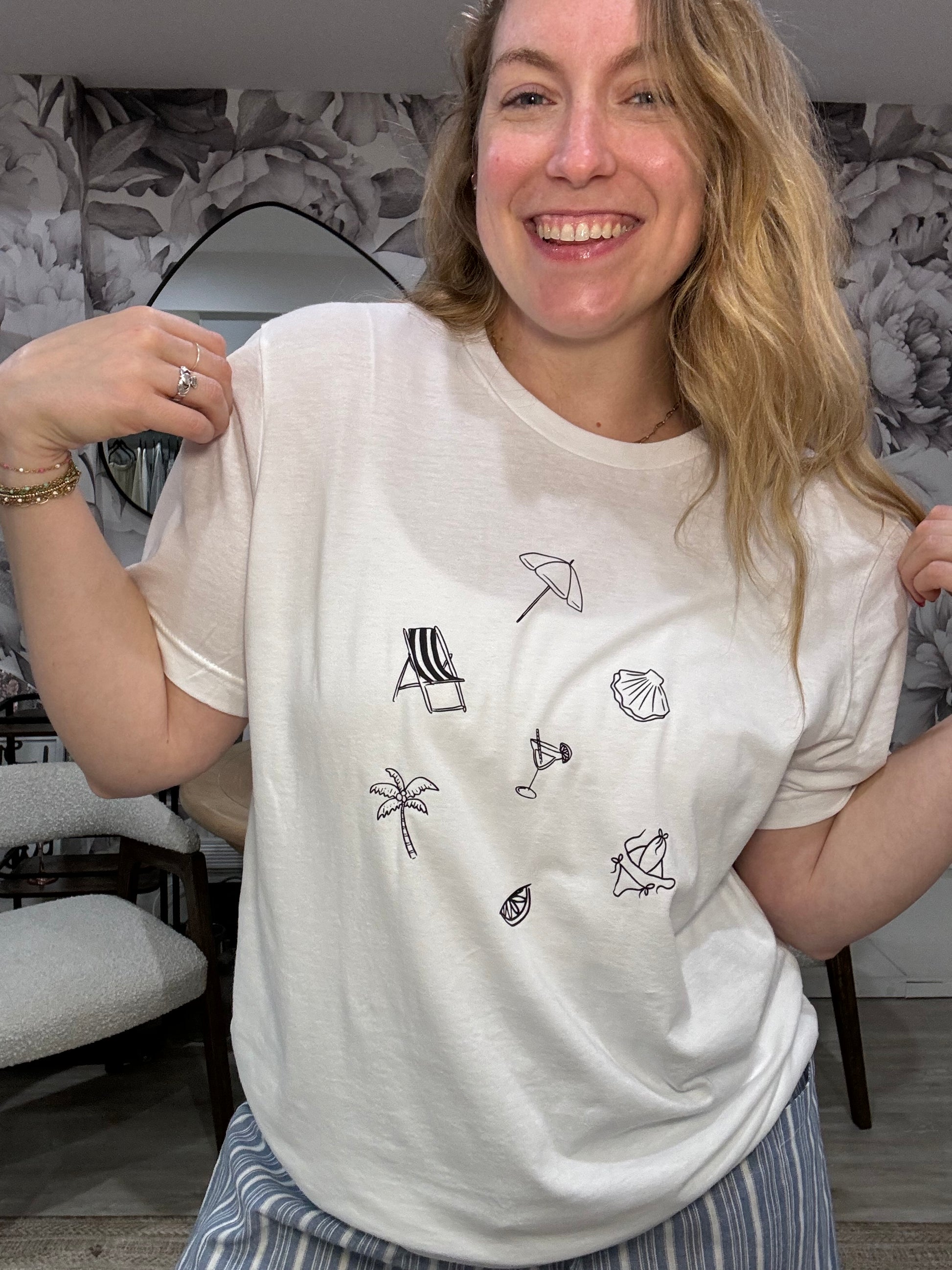 Get ready to hit the shore in style with our Beach Day Tee. This soft and comfy white long tshirt features an all-in-one design that includes everything you love about a day at the beach. Perfect for any casual outing, this tee is a must-have for your summer wardrobe!
