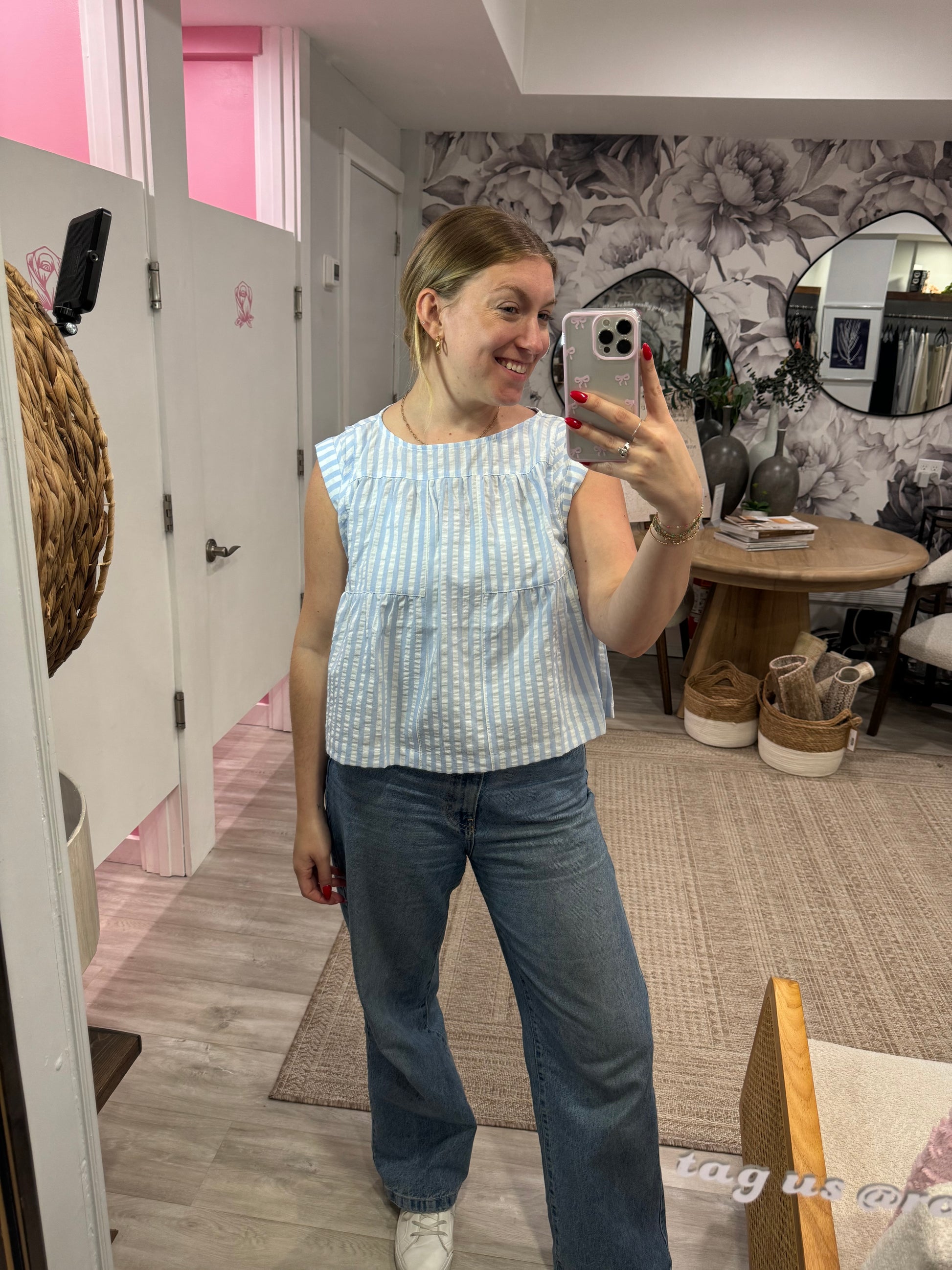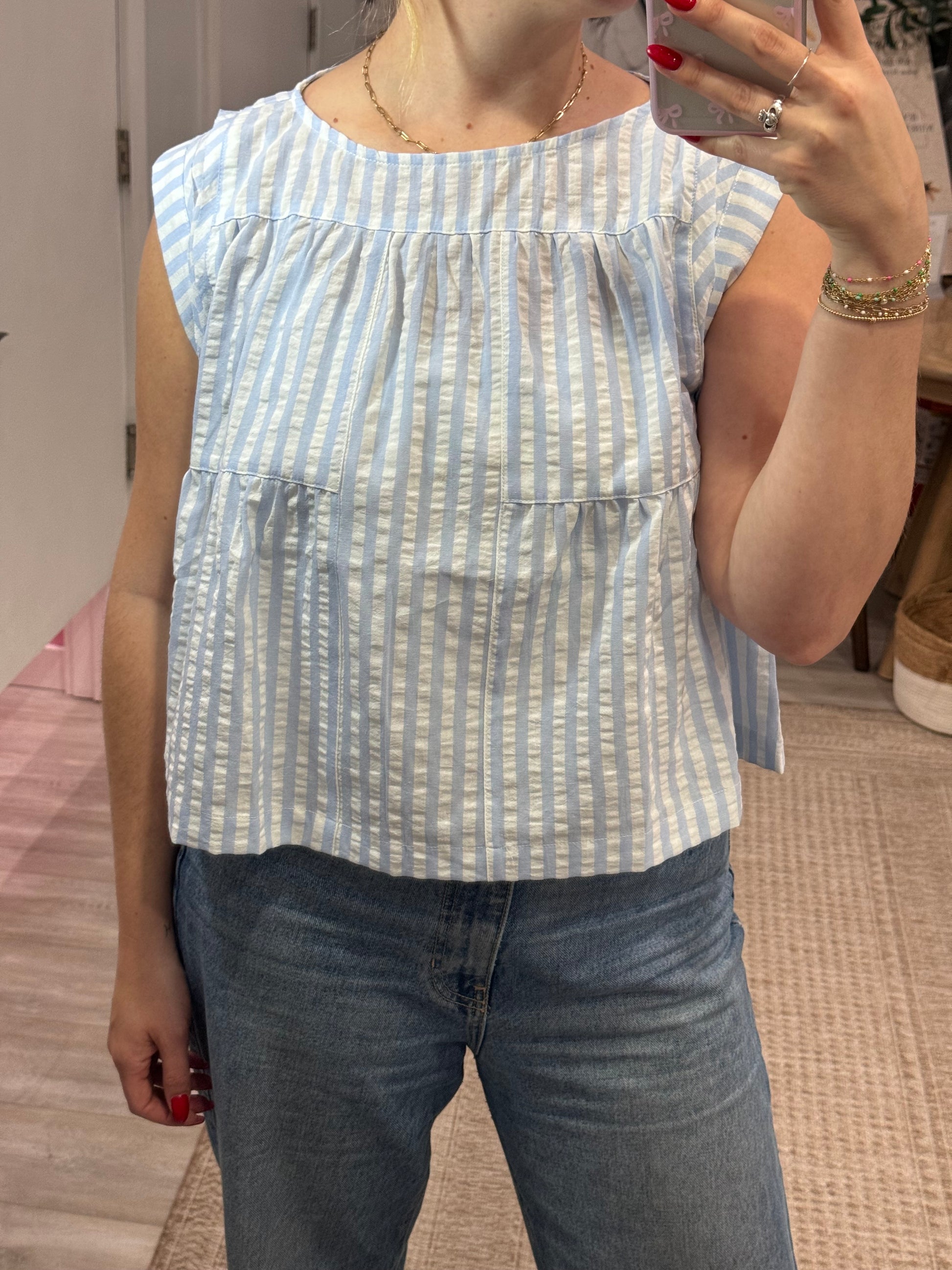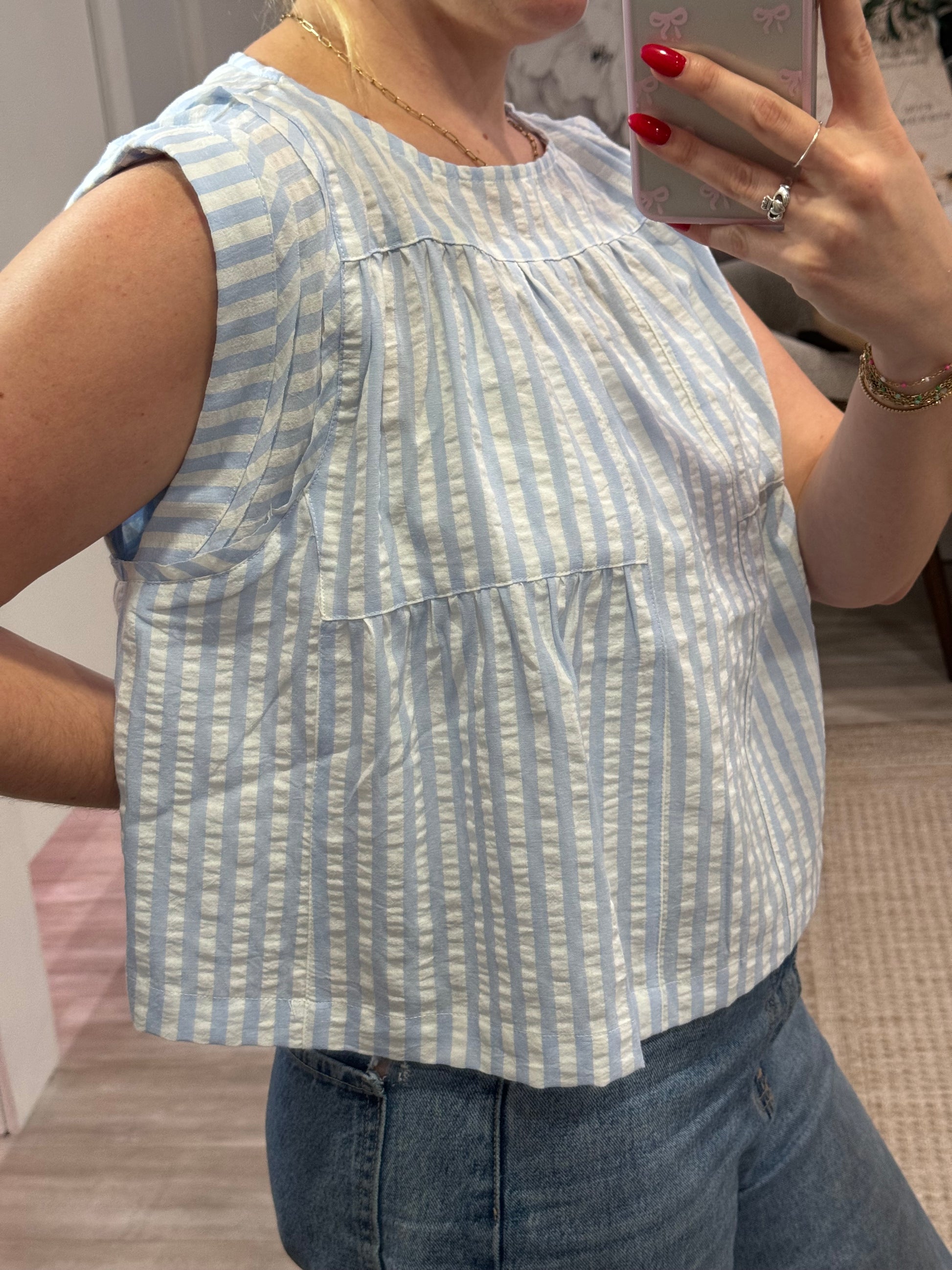 Feel the beach vibes with our Capri Top! This chic top features light blue and white stripes, a breezy boxy cut, and adorable cap sleeves. Perfect for those laid-back beach evenings.