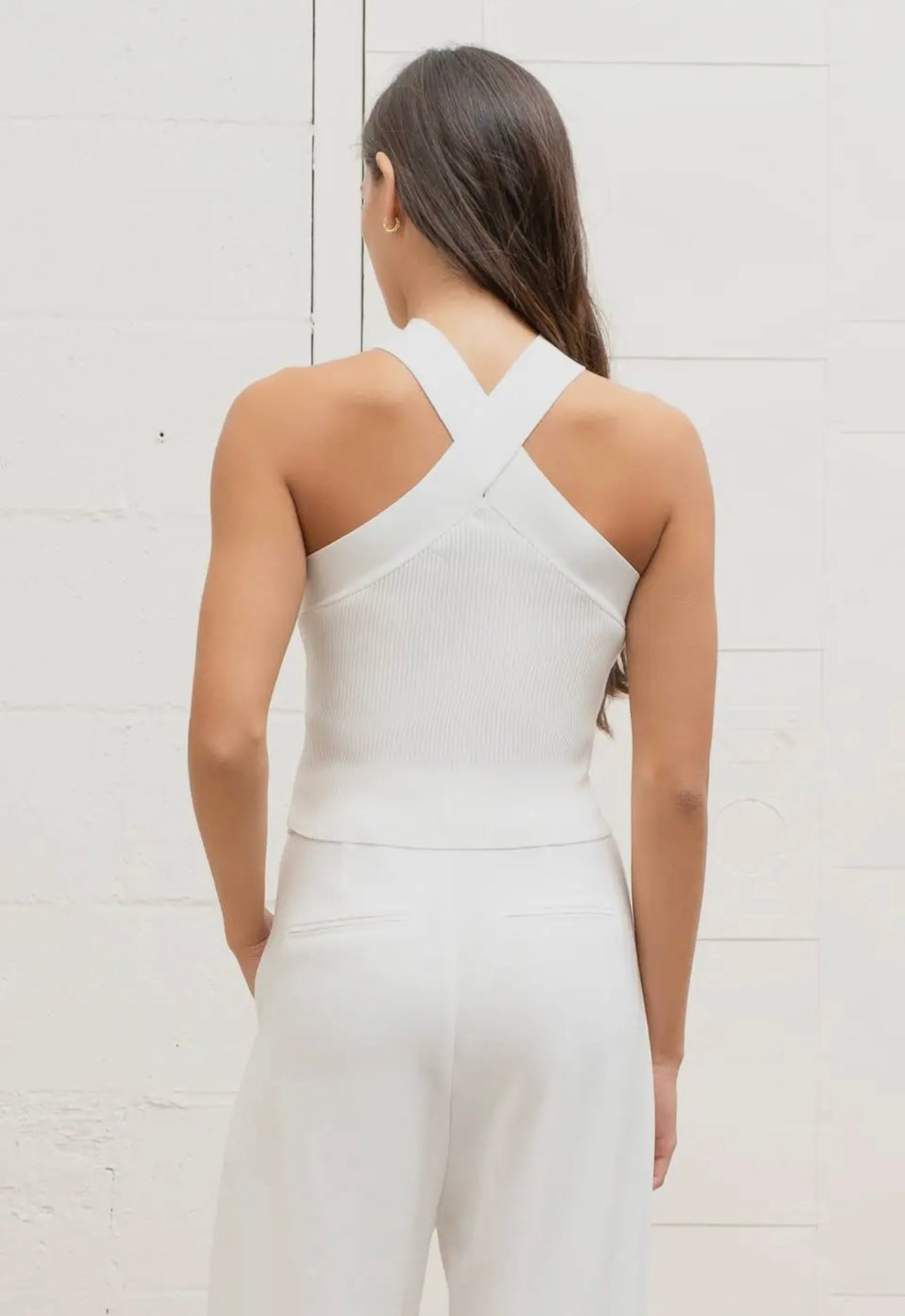 Our charmed tank top is perfect for your summer night out! With its cross, halter neckline and slightly cropped fit make this easy to style.