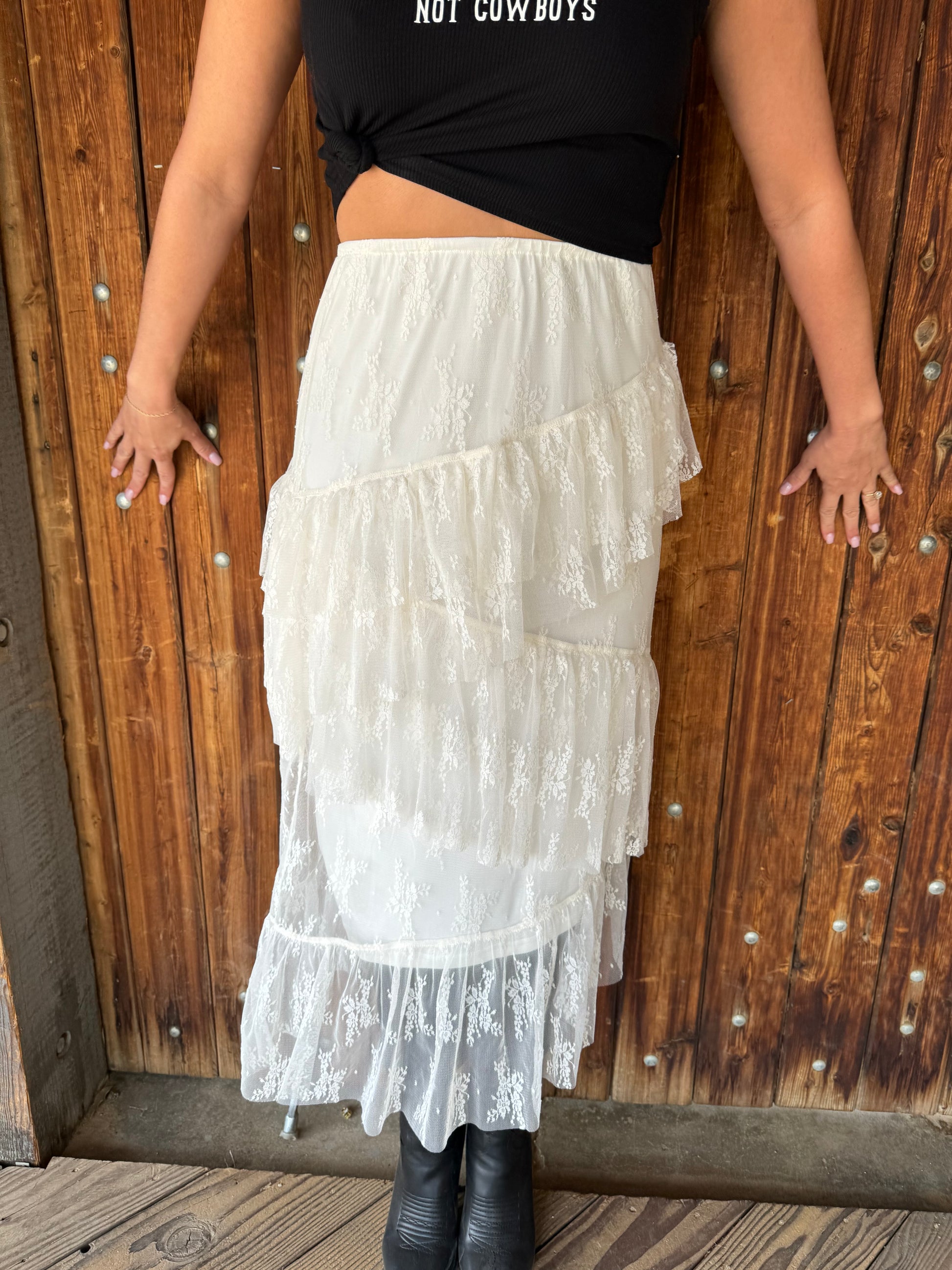Embrace the romance of the desert with our Desert Rose Lace Skirt! Crafted in a creamy, delicate hue, this asymmetrical tiered lace skirt captures the essence of romance and sophistication.
