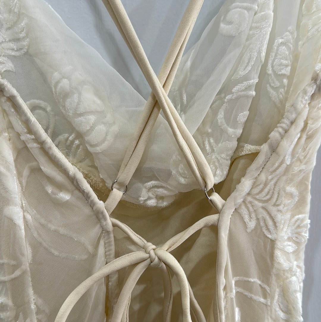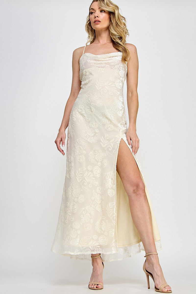 White slip with sheer overlay embroidered with floral pattern in velvet. Slit up the right leg and back lace up detailing. Slight cowl neckline.