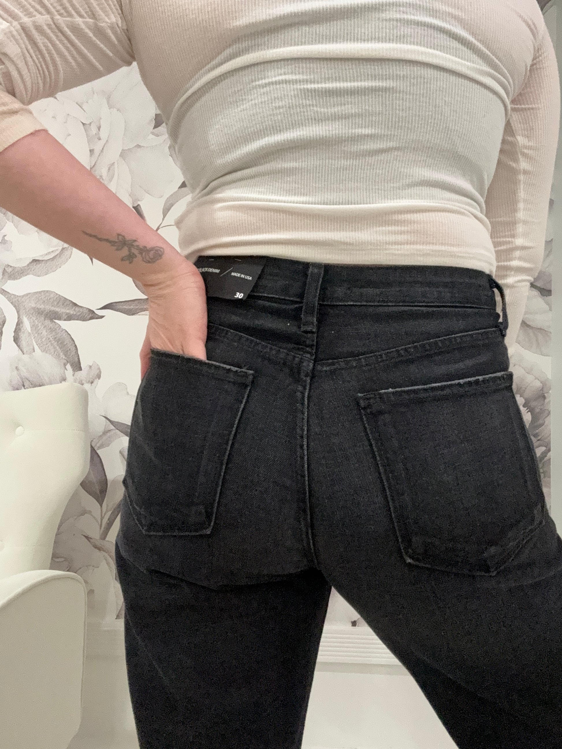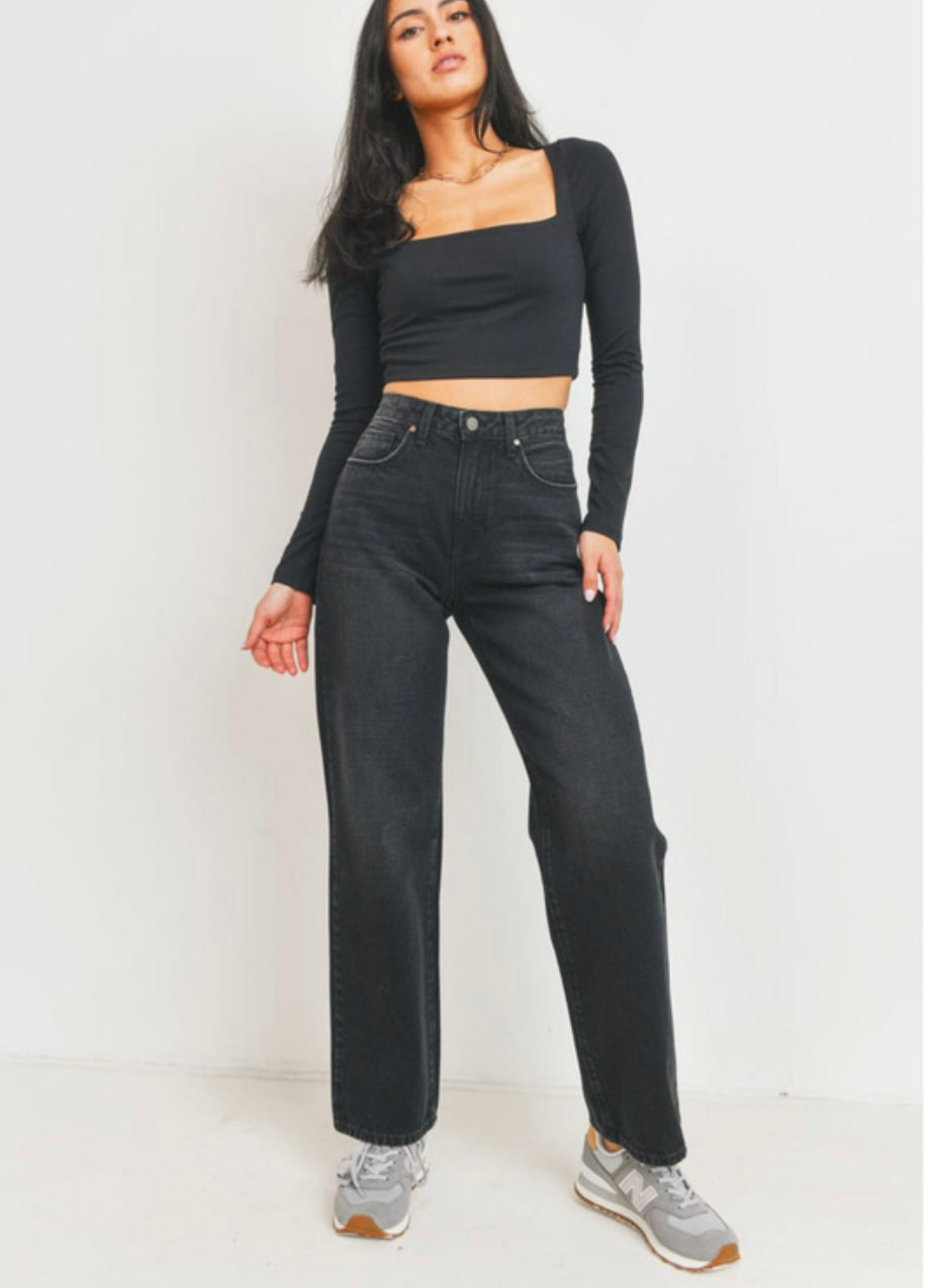 Upgrade your denim game with our High Rise Dad Jean. Designed with a distressed pocket for a touch of edge, these jeans offer a comfy fit and a high rise for a flattering silhouette. Perfect for everyday wear. Washed black, wide fit jeans.