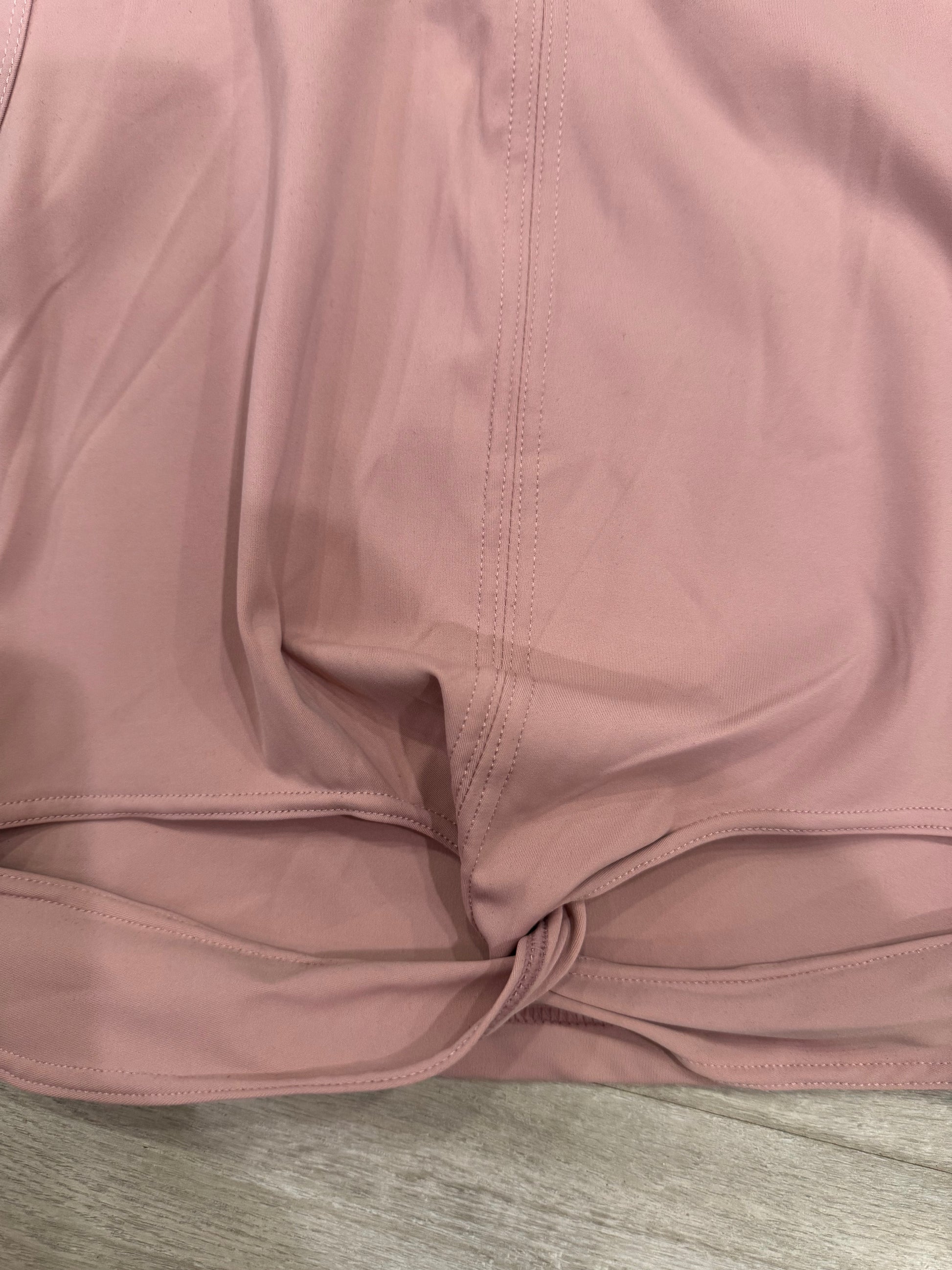 Moisture wicking stretch fabric tank has a high neckline, a sleeveless bodice, and a cropped hem with a twisted cutout at front