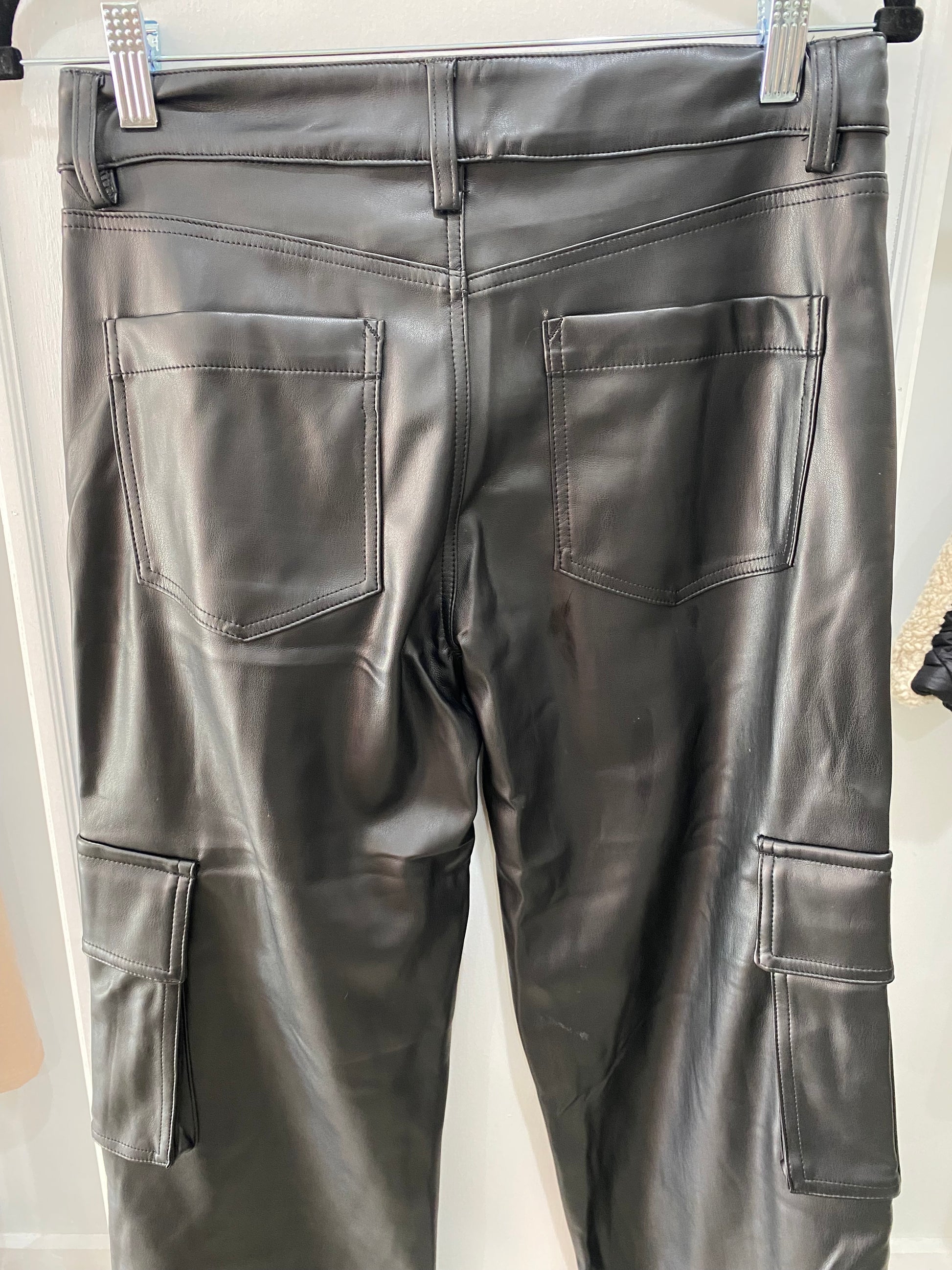 These Vegan Leather Cargo Pants offer a stylish and comfortable look with a black button closure and two side cargo pockets. Crafted from vegan leather, the pants provide a polished but trendy look.